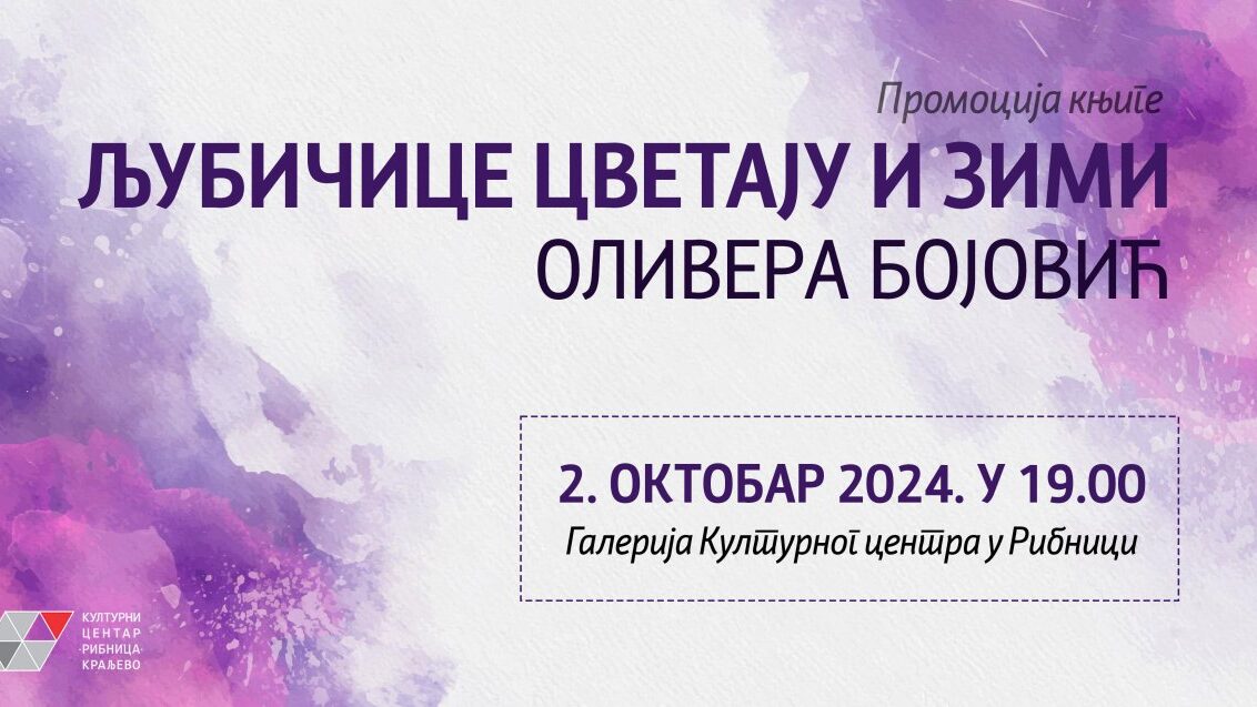 У среду, 2. октобра у 19 часова, у галерији Културног центра у Рибници, одржаће се промоција књиге „Љубичице цветају и зими” Оливере Бојовић из Краљева. Књигу поезије објавила је ове године издавачка кућа Поетикум из Краљева.